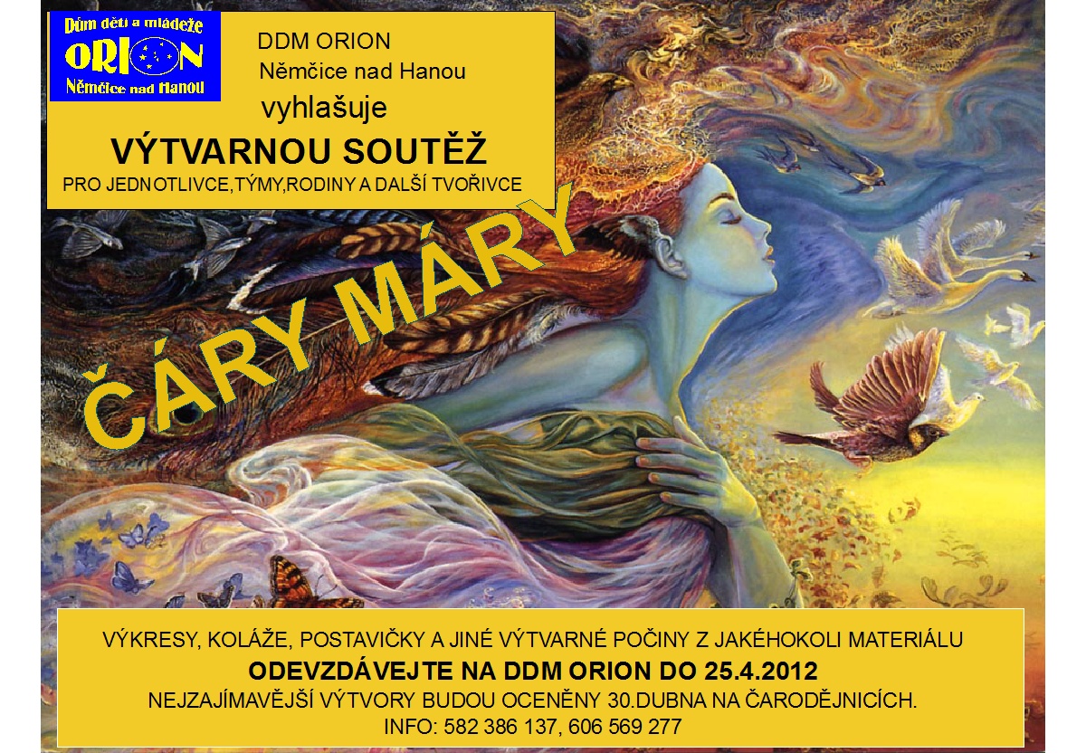 Aktuální nabídkou DDM Orion je také vyhlášení VÝTVARNÉ SOUTĚŽE ČÁRY MÁRY. Soutěže se mohou zúčastnit naprosto všichni, kterým se chce vytvořit něco s tématikou čarování, čarodějnic, čar a kouzel. Soutěž je otevřená všem věkovým kategoriím, skupinkám přátel, rodinám, třídám atd. Pro všechny přihlášené jsou připravené sladkosti a pro vítěze zajímavé ceny. Nejzajímavější výtvory budou oceněny na Čarodějnicích 30.dubna 2012 v Němčicích nad Hanou. Termín odevzdání výrobků je 25.4.2012. Podrobnosti na pozvánce.