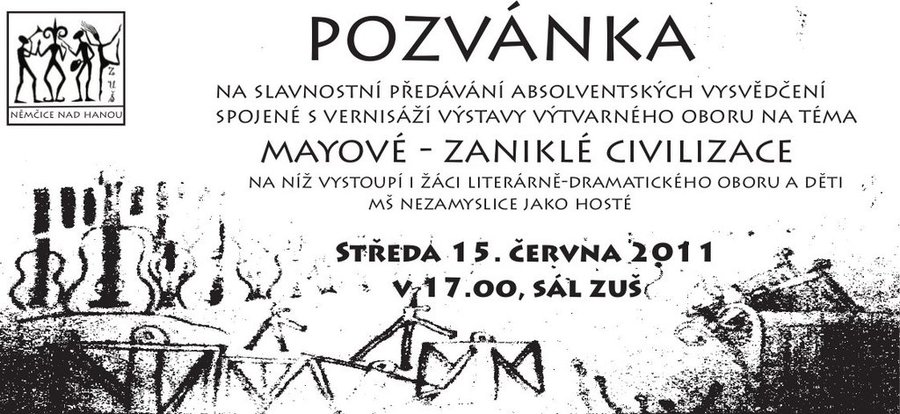 Dne 15.6.2011 v 17.00 hodin se v sále ZUŠ v Nemčicích nad Hanou koná vernisáž složená z celoroční práce dětí z výtvarného oboru. Letošní téma bylo "Indiáni - Mayové". V rámci této akce bude kulturní indiánský program, v němž vystoupí i žáci literárně-dramatického oboru a děti MŠ Nezamyslice jako hosté.