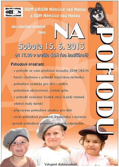 Představí se vám děti z kroužků DDM ORION a ukážou vám, co se za celý školní rok naučily. Jsou připraveny pohodové soutěže pro děti i jejich rodiče, v pohodě oslavíme svátek otců a každý tatínek od nás dostane malinký ( tekutý) dárek. Pro děti jsou připraveny pohodové atrakce a výtvarné dílničky, večer zakončíme pohodovým setkáním u táboráku. také zde získáte informace o tom, které kroužky vám nabídneme od září příštího školního roku, samozřejmě v pohodě :). Předsatví se vám také veškerá hasičská technika. Po celou dobu akce bude příjemné občerstvení. Těší se na vás organizátoři akce.