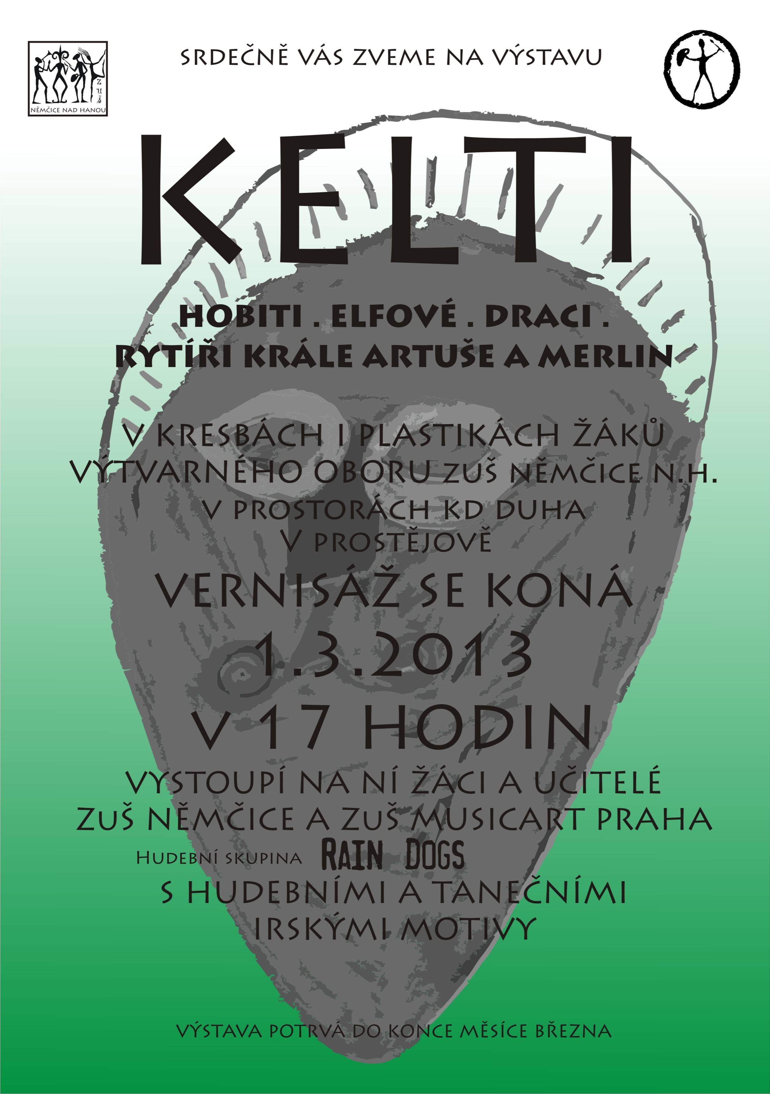 ZUŠ Němčice nad Hanou zve dne 1.3.2013 nejen rodiče, ale všechny, kteří si rádi prohlédnou a ocení výsledky umělecké tvorby žáků, na vernisáž s názvem KELTI, HOBITI, ELFOVÉ, DRACI, RYTÍŘI KRÁLE ARTUŠE A MERLIN.