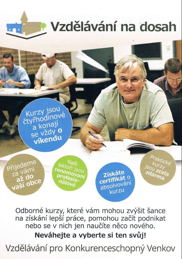 Odborné kurzy vám mohou zvýšit šance na získání lepší práce, pomohou začít podnikat nebo se v nich jen naučíte něco nového. Konkrétní seznam a popisy kurzů najdete na stránce Kurzy.
